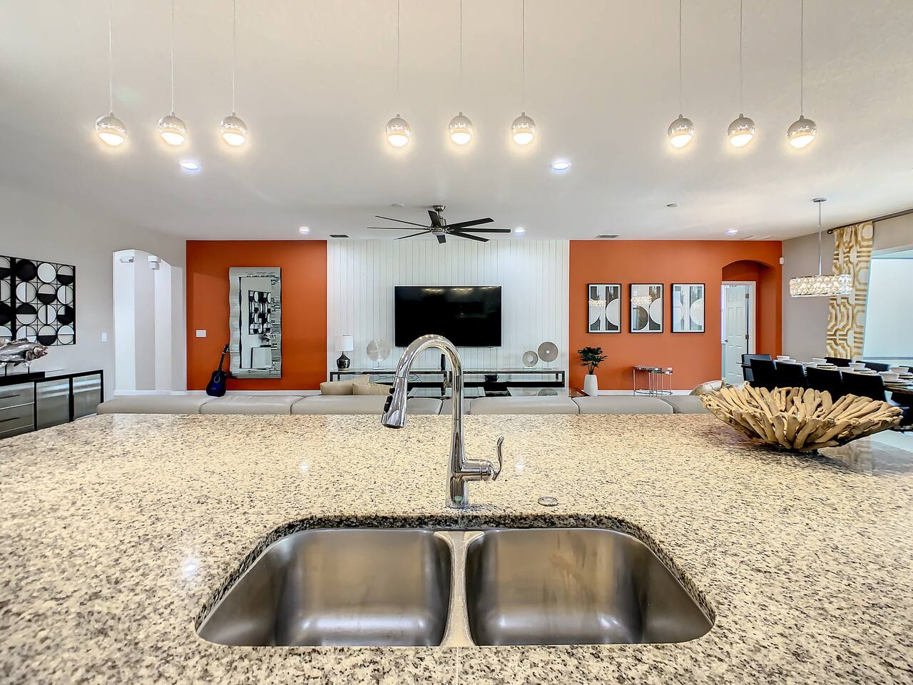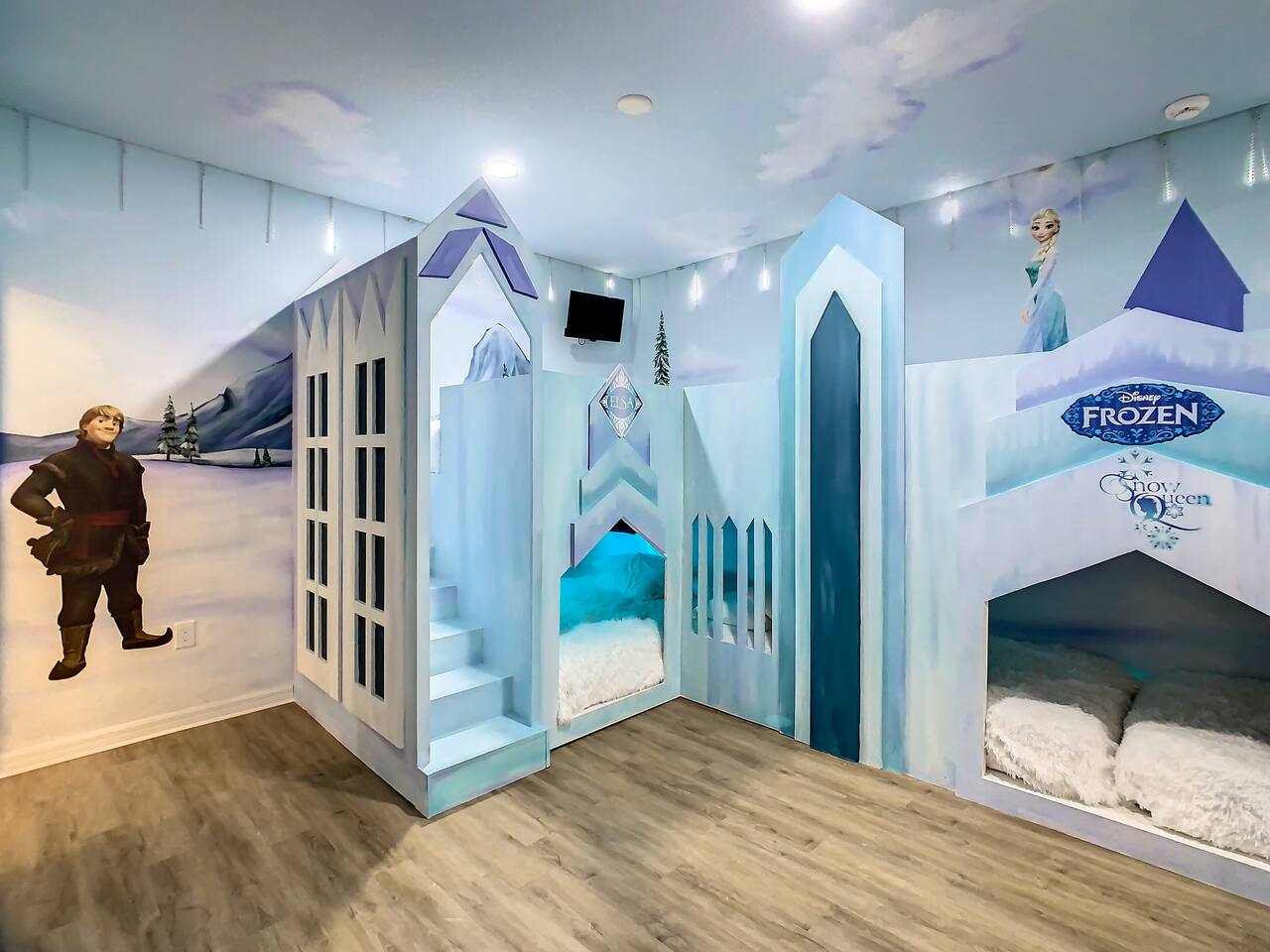 The beautiful Solterra Resort Mansion includes 11 BR, 11 Bath & sleeps 32+. Themed rooms include Moana, Frozen, Marvel and Toy Story. Enjoy the theatre room, pool table, karaoke stage, game room w/ Virtual Reality, private pool and hot tub! For adults, there are 7 king bedrooms and 6 have own bathrooms, 6500 sq ft. You'll never want to leave this secluded, private (gated) community with water park and amenities. Parks are so close! Disney is only 10 miles, and Universal is 19.